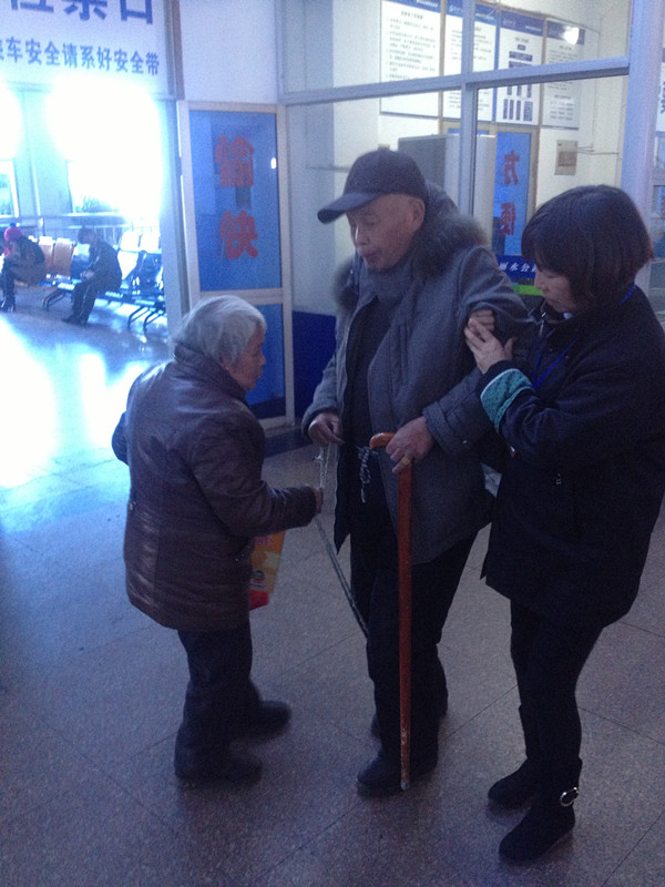 蔡美娟攙扶著老大爺,他老伴拉著繩子,走一步提一下大爺?shù)挠夷_緩慢的行走著。就這樣,蔡美娟扶著老大爺走幾步,就要稍停一下,等老大爺喘下氣再繼續(xù)走。由于13號(hào)檢票口位于東站候車(chē)廳的最里面,從售票廳走過(guò)去還是有100多米的樣子。一路上老大爺不停的問(wèn)到了沒(méi)有,蔡美娟感覺(jué)到老大爺雖然有她扶著可還是有點(diǎn)吃不消了,就不斷的鼓勵(lì)老大爺:“再堅(jiān)持一下,我們就要到了!”就這樣,短短的100多米,他們?nèi)齻€(gè)人卻艱難的走了五六分鐘。(相關(guān)視頻已經(jīng)上傳在群空間)